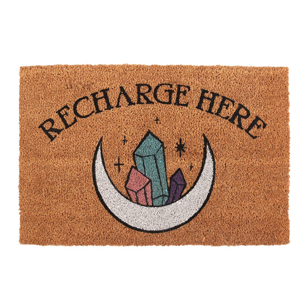 Remind guests that your home is a safe space for all with this trendy doormat that features the ‘Recharge Here’ text accented by crystals and a mystical moon.